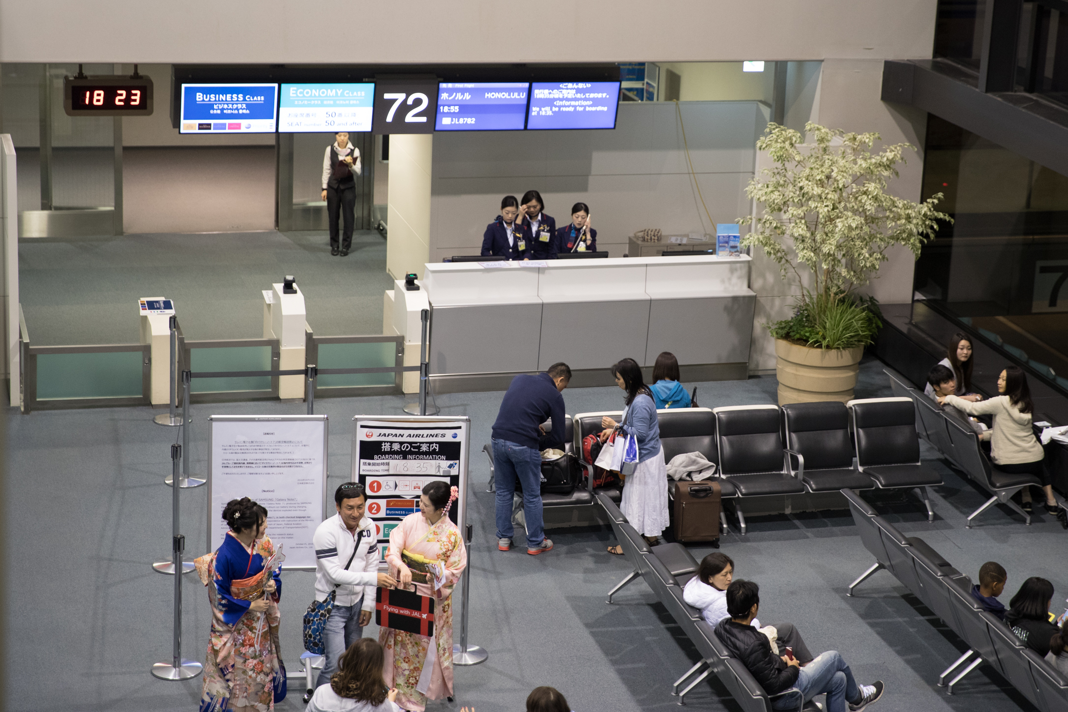 時間つぶしが終わったら搭乗ゲートへ進みます。着物姿のスタッフさんが目立ちますねー。これは一緒に写真撮りたくなる方もたくさんいますよ。そして待ち構える報道カメラ陣。芸能人がちらほらいますね。さっ、長時間フライトの始まりです。