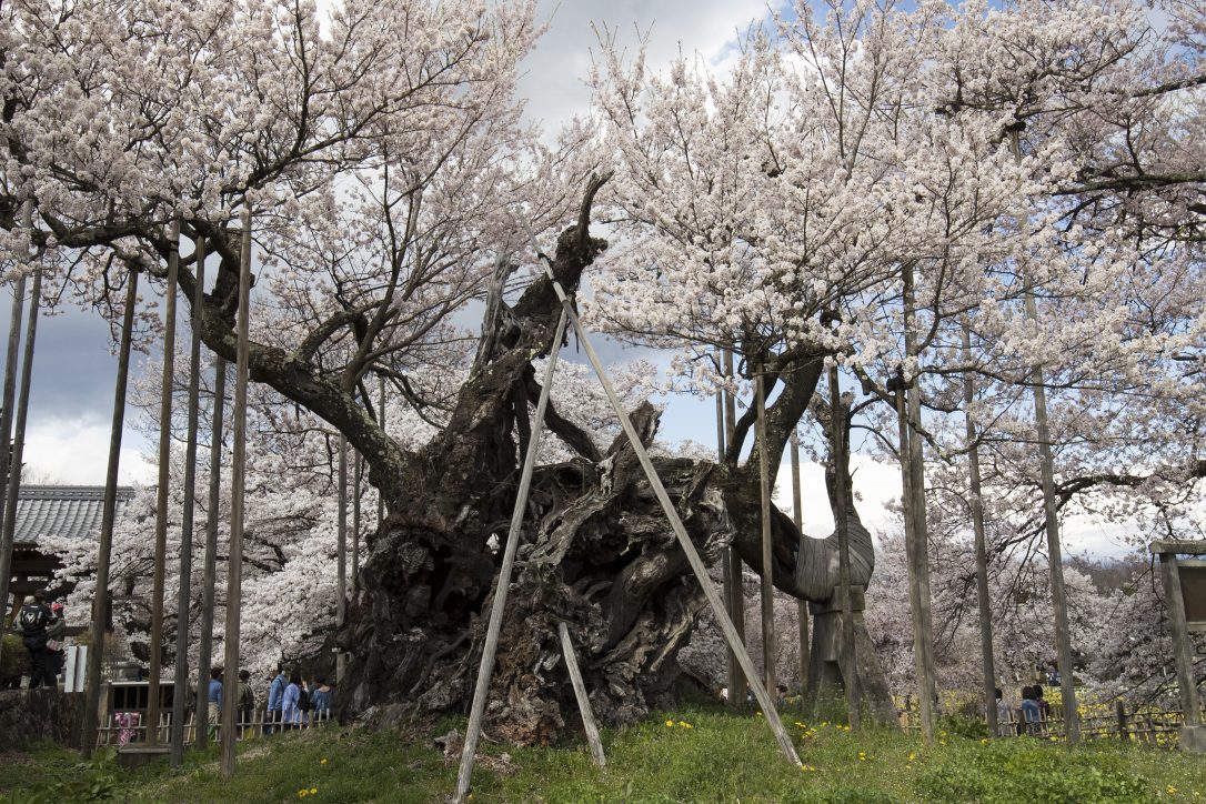 山高神代桜は、入り口から一番奥にあります。エドヒガンザクラで、樹齢は2000年を超えており、たくさんの衝立によって支えられています。